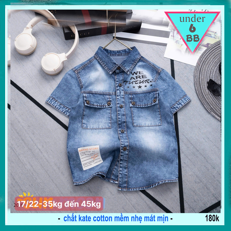 Áo sơ mi bé trai tay ngắn ( vải jean ) in chữ phối 2 túi áo phong cách cá tính cho bé diện đi chơi , đi học