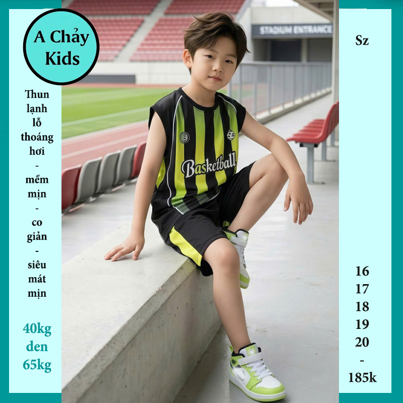 Đồ bộ bé trai thun lạnh sát nách in chữ Basketball phối sọc phong cách bóng rổ cho bé đi chơi , đi học