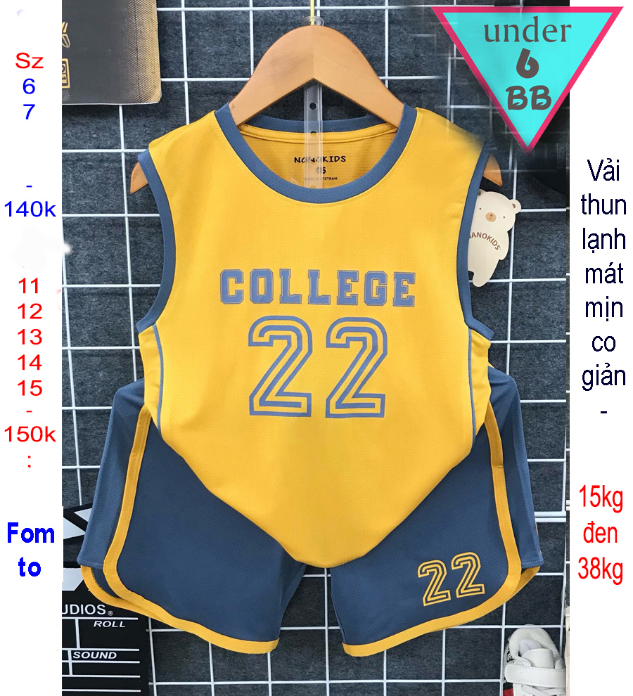 Đồ bộ bé trai thun lạnh sát nách thể thao in chữ số College 22 phong cách bóng rổ cho bé đi chơi , đi học