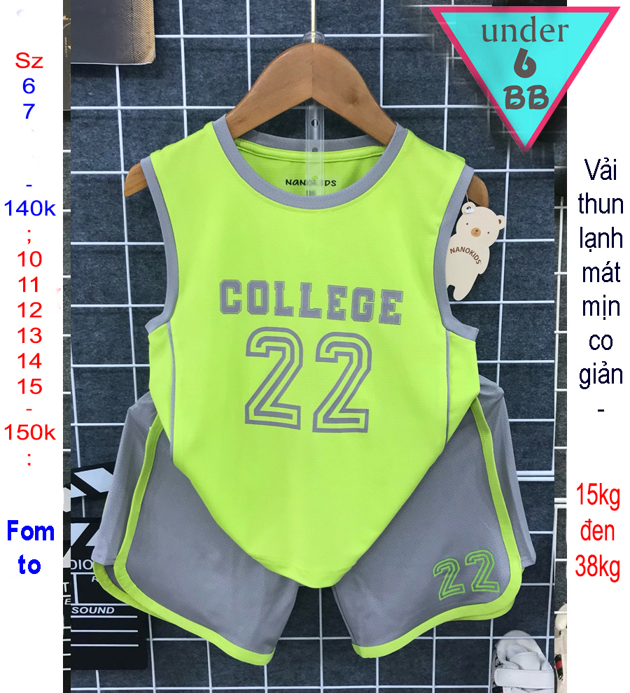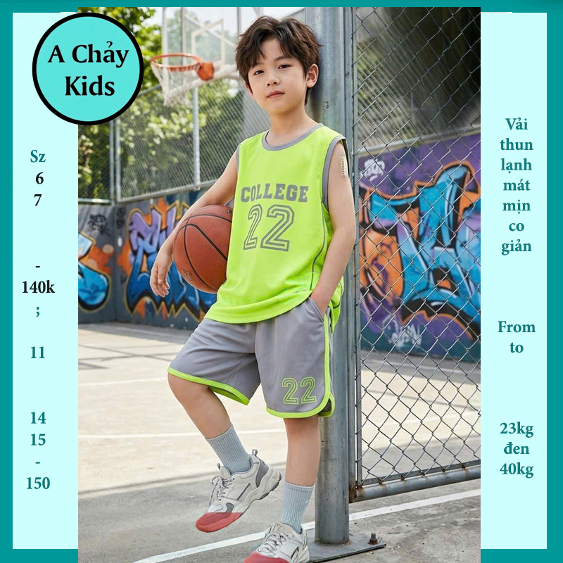 Đồ bộ bé trai thun lạnh sát nách thể thao in chữ số College 22 phong cách bóng rổ cho bé đi chơi , đi học
