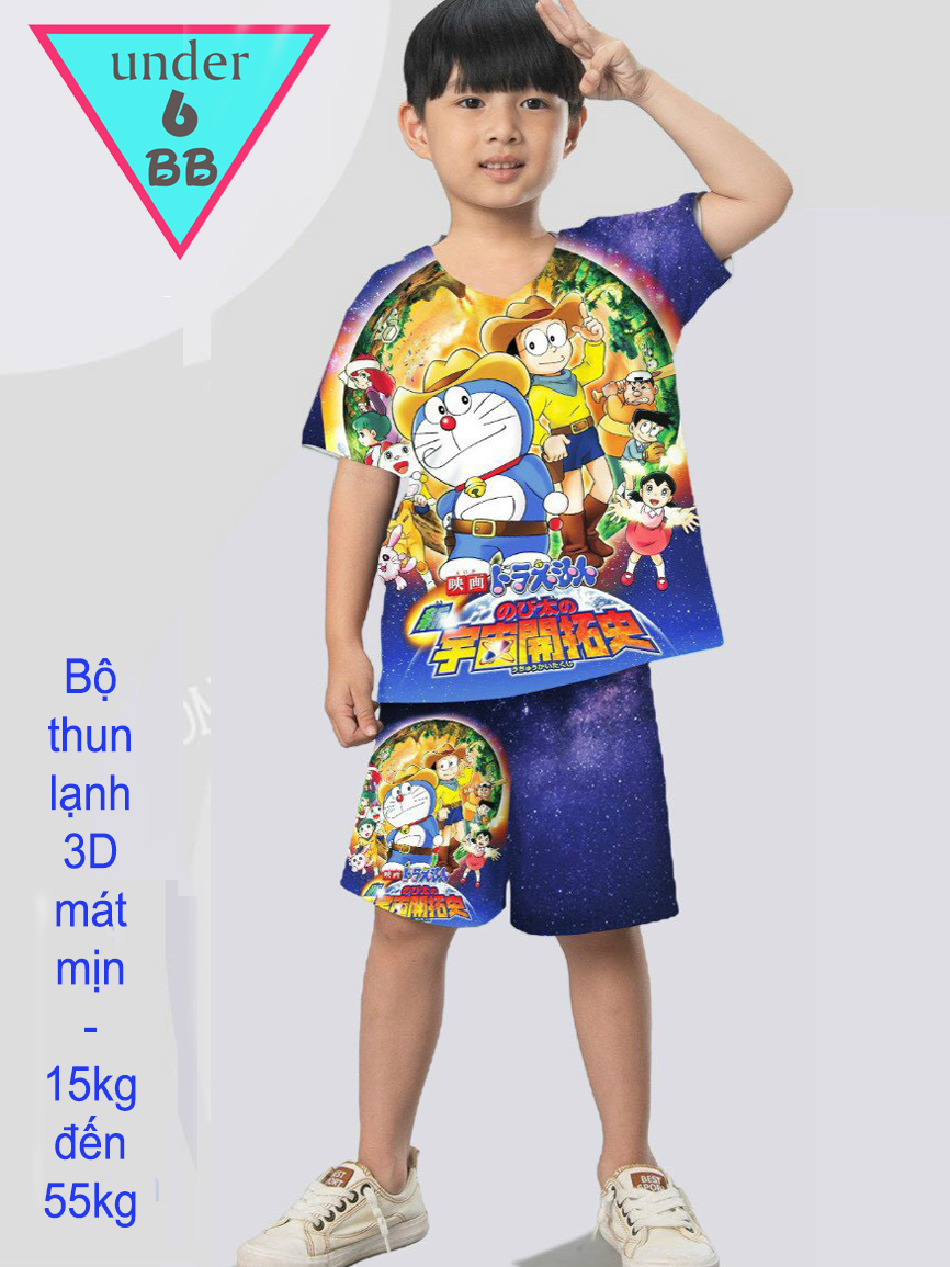 Đồ bộ bé trai thun lạnh tay ngắn in 3D Doreamon cho bé đi chơi , đi học