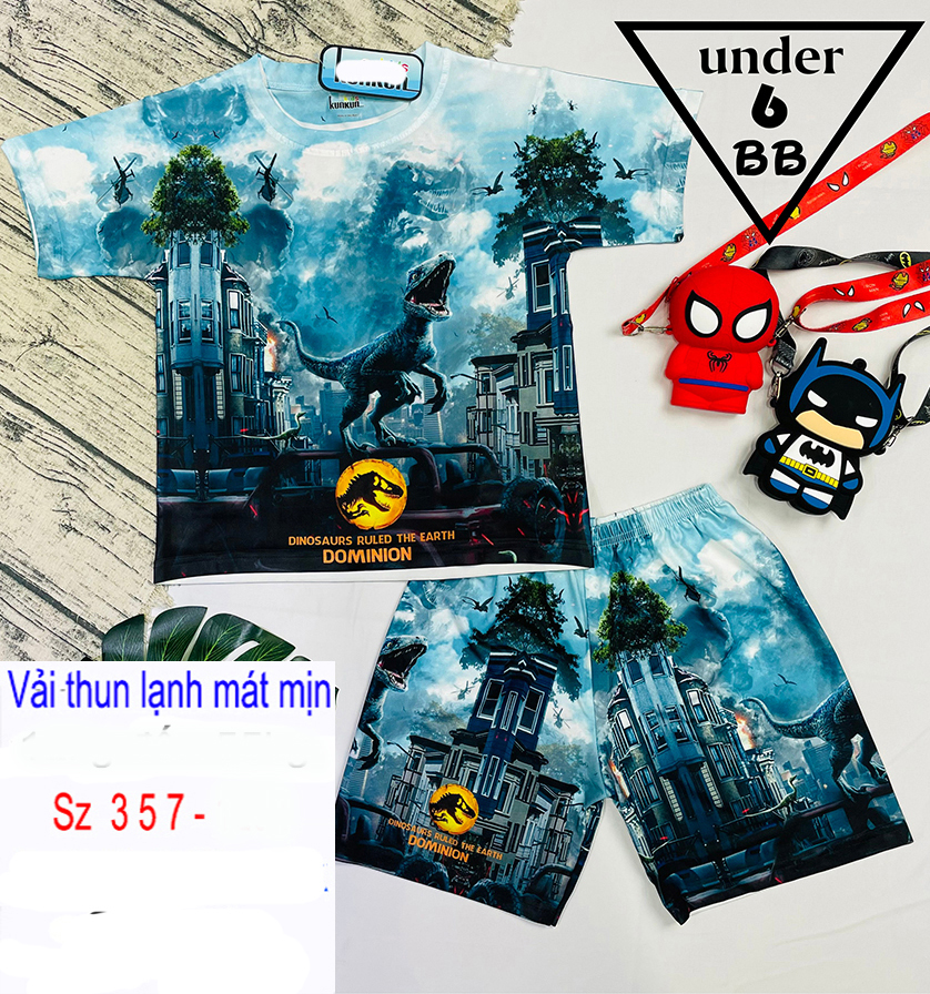 Đồ bộ bé trai thun lạnh tay ngắn in 3D hình khủng long cho bé đi chơi , đi học