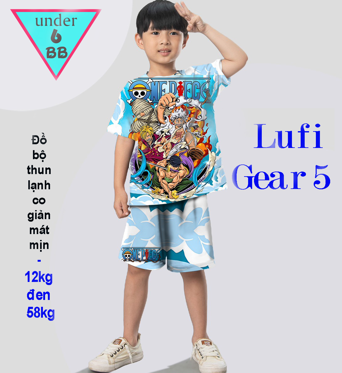 Đồ bộ bé trai thun lạnh tay ngắn in 3D hình Luffy Gear 5 cho bé đi chơi ,đi học