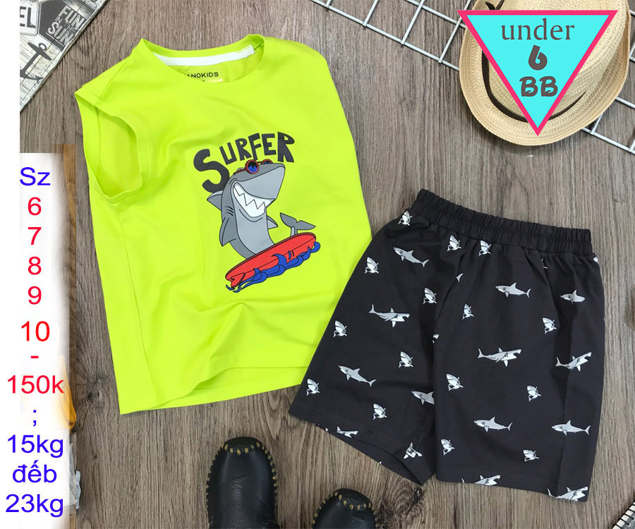 Đồ bộ sát nách bé trai cotton in hình cá mập siêu đáng yêu cho bé trai đi chơi , đi học