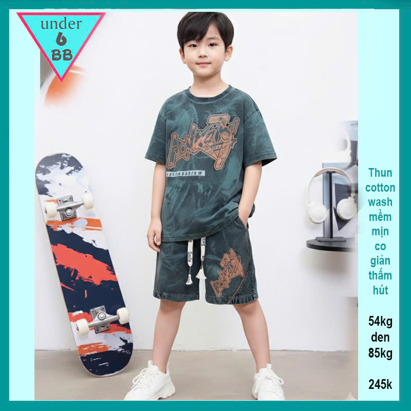 Đồ bộ bé trai cotton tay ngắn ( vải wash ) in chữ nổi phong cách thời trang cá tính cực ngầu cho bé diện đi chơi , đi học
