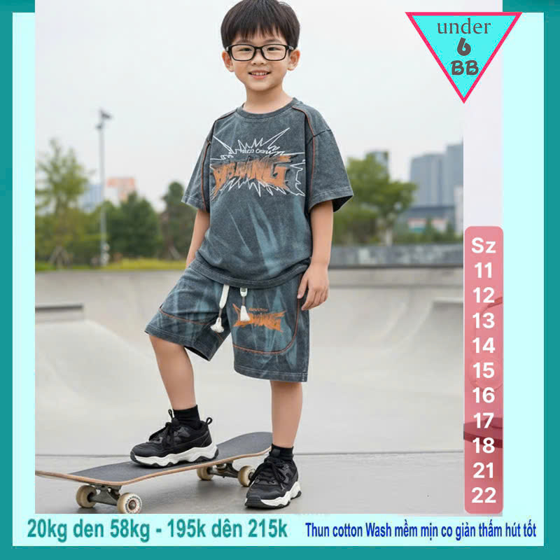 Đồ bộ bé trai cotton tay ngắn ( Vải wash ) in chữ dập nổi phong cách cá tính siêu ngầu cho bé diện đi chơi , du lịch