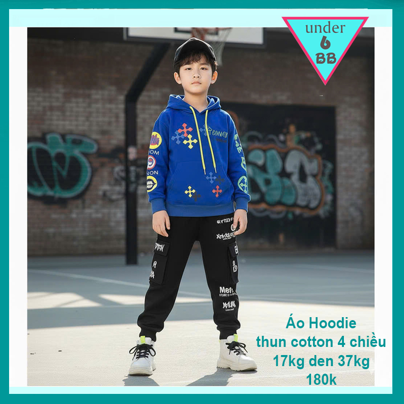 Áo thun bé trai tay dài có nón in chữ phong cách cá tính cho bé diện đi chơi , du lịch