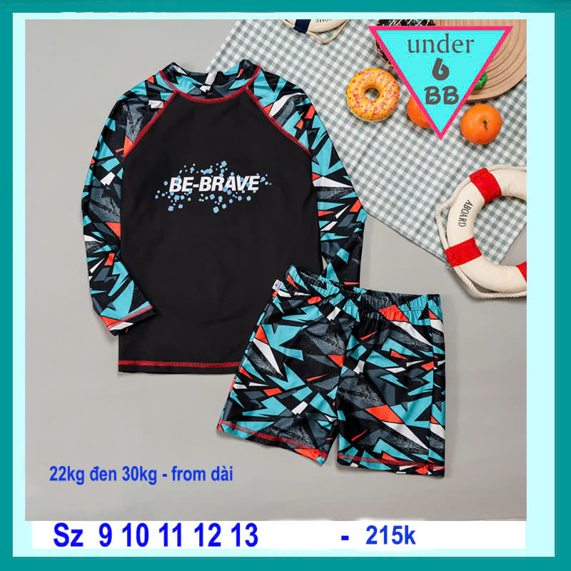 Đồ bơi bé trai tay dài ( Phom dài ) in chữ phối tay lắp lăn phong cách đi biển , đi bơi