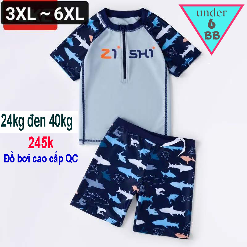 Đồ bơi cho bé trai tay ngắn in 3D cá mập phối chữ cho bé đi biển , đi bơi ( đồ bơi rời )