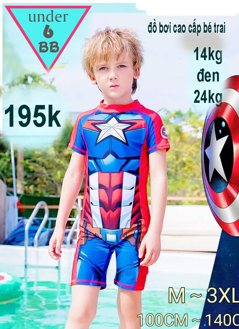 Đồ bơi cho bé trai tay ngắn liền thân in 3D hình logo Đội Trưởng Mỹ cho bé đi bơi , đi biển