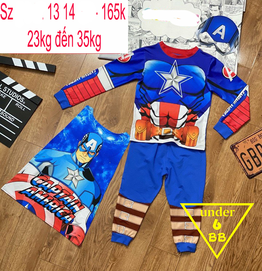 Đồ bộ tay dài in 3D Đội Trưởng Mỹ -Captain america cho bé đi ngủ , đi chơi Cosplay ( kèm cánh , nạ )