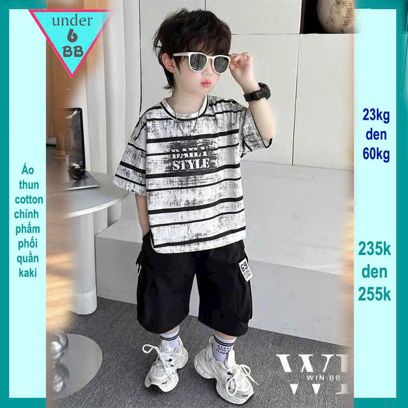 Quần áo bé trai ( Áo thun cotton + Quần kaki ) in sọc phong cách cá tính cho bé đi chơi , đi học