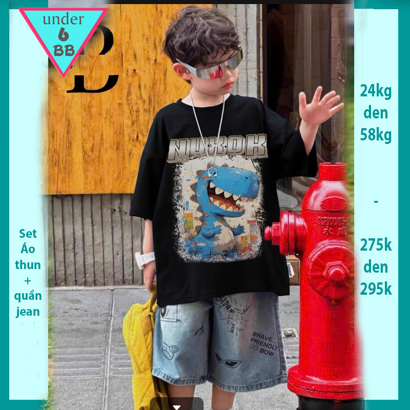 Set bộ jean bé trai ( áo vải thun cotton - quần jean co giãn ) in hình Khủng Long cho bé diện đi chơi , đi học