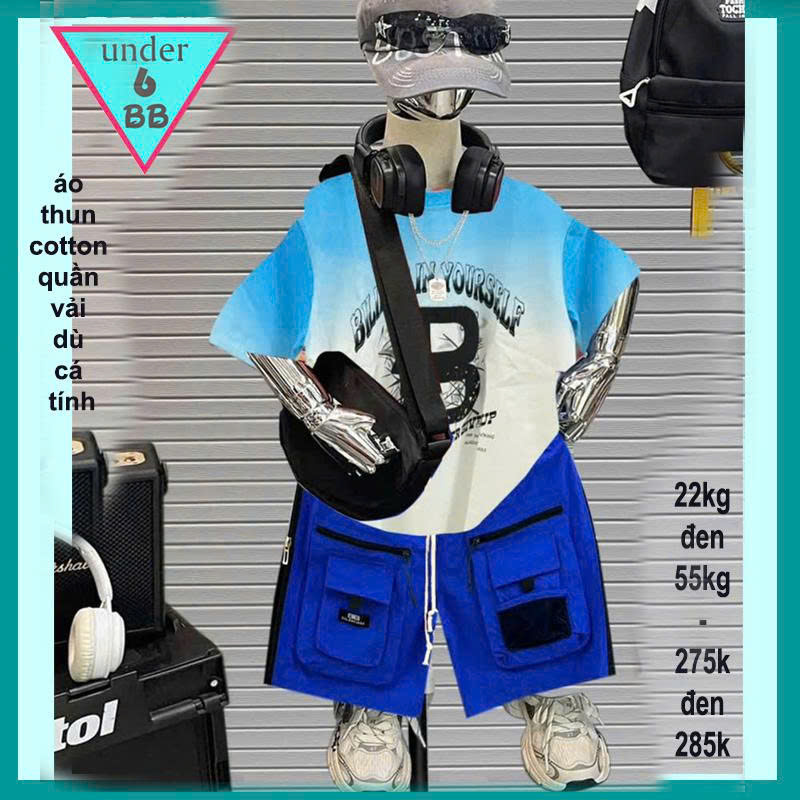 Quần áo bé trai ( Áo thun cotton + Quần vải dù ) in chữ phối màu loang phong cách cực cá tính sang trọng cho bé đi chơi , đi du lịch