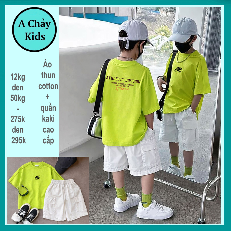 Set bộ kaki bé trai ( Áo thun cotton + quần kaki ) in chữ phong cách cá tính cực sang cho bé diện đi chơi , du lịch