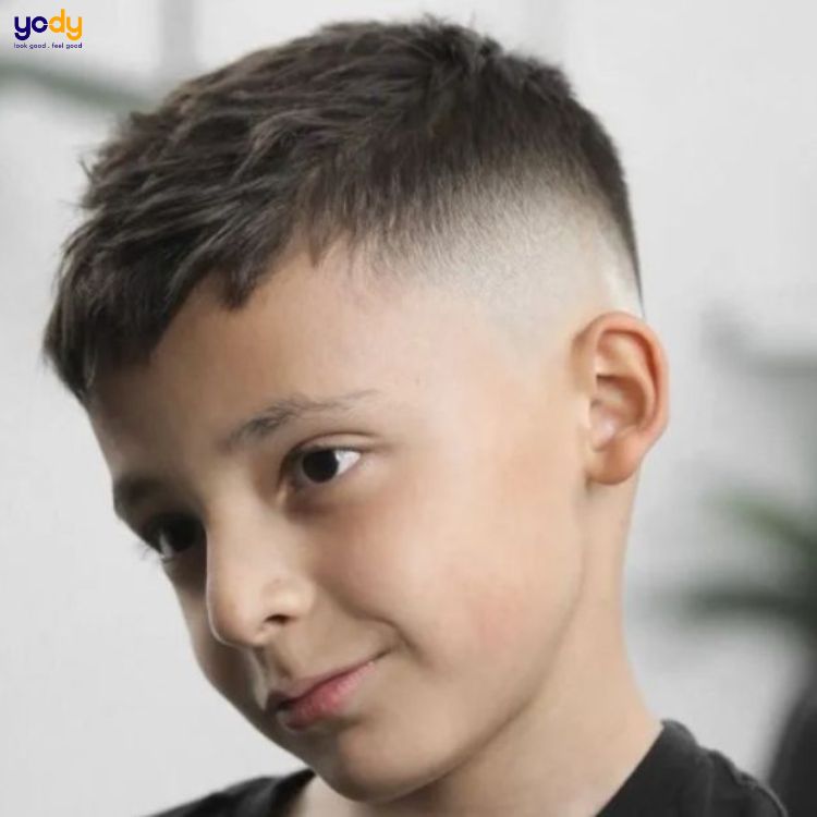 Kiểu tóc cắt ngắn là lựa chọn phổ biến và thông dụng nhất cho những bé trai ít tóc. Kiểu tóc này chăng những gọn gàng lại còn giúp cấc bé thoải mái, năng động cả ngày dài. Kiểu tóc này có độ ngắn chỉ từ 1 đến 2cm trên đỉnh đầu sau đó được tỉa gọn dần về cuối gáy và hai bên mai.